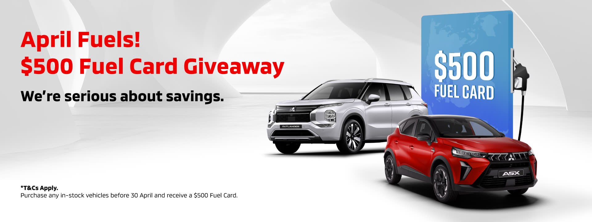 Purchase any in-stock Mitsubishi before 30 April and receive a $500 Fuel Card on us.